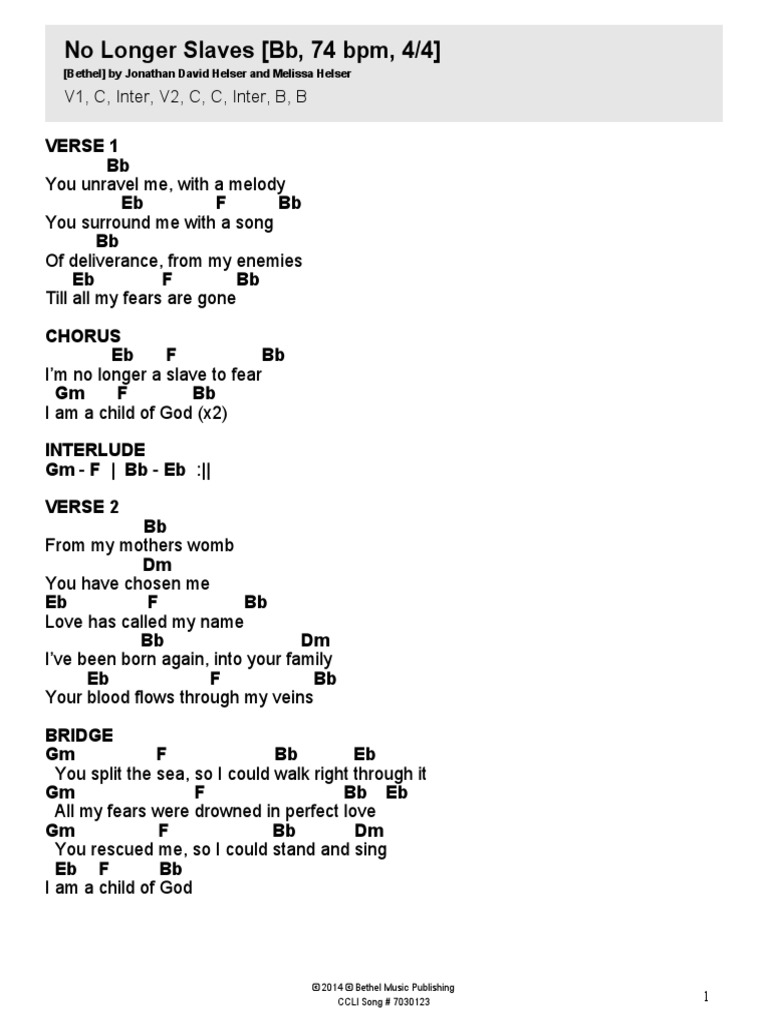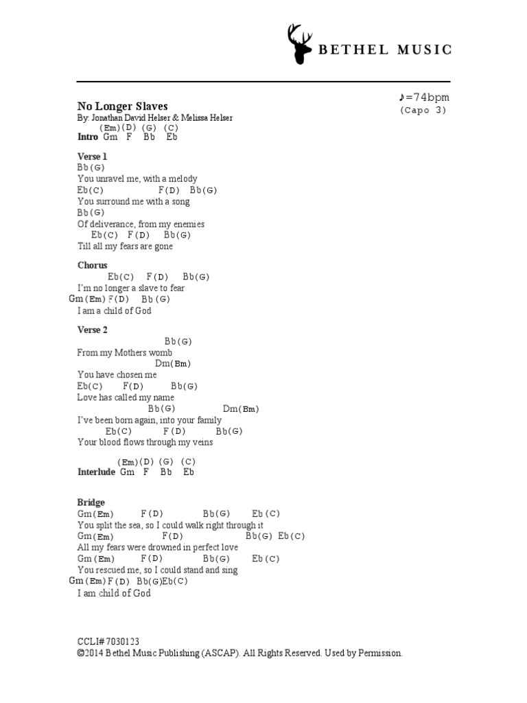 No Longer Slaves Capo 3 Autosaved No Longer Slaves Ccli 7030123 Jonathan David Helser Melissa Helser Capo 3 Verse 1 Vocals Piano Guitar G C D G Course Hero