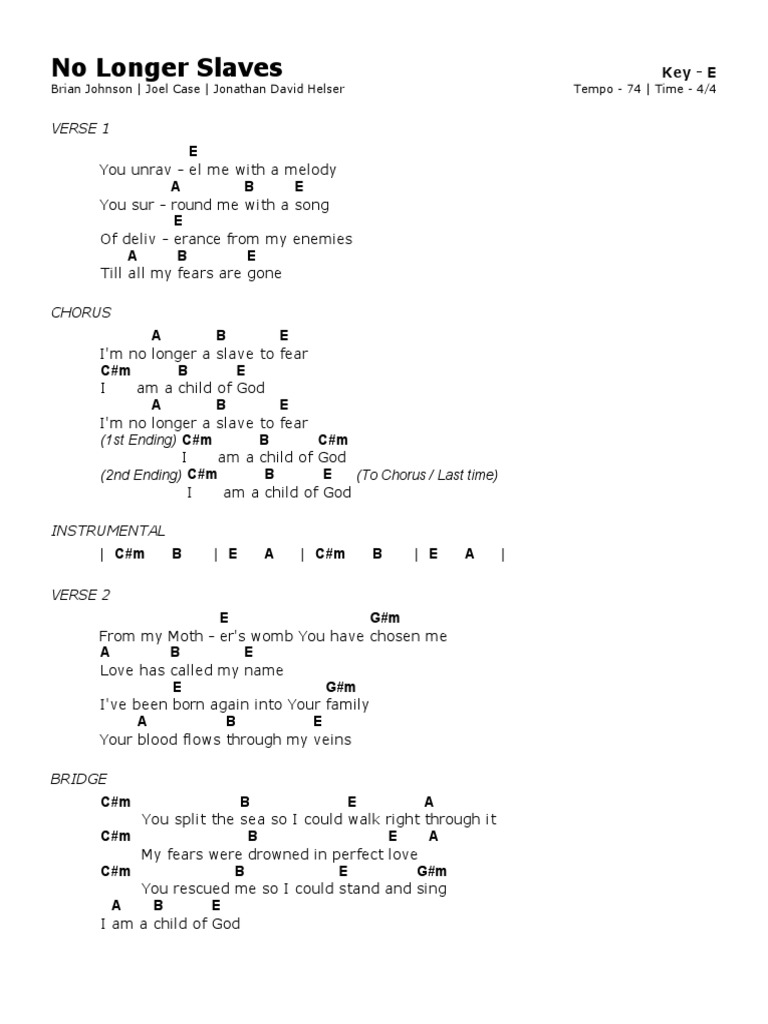 No longer slaves piano. No longer slaves chords bethel music jonathan helser worship chords verse 1 bb you unravel me with a melody ebbb fbb bb you surround me with a song of deliverance from my enemies ebbb fbb bb till all my fears are gone chorus eb f bb gm f bb im no. Download and print in pdf or midi free sheet music for no longer slaves arranged by jeffreykwong for piano vocals piano voice. Products for this song include chord charts lead sheets choir parts and the orchestration. Im no longer a slave to fear i am a child of god im no longer a slave to fear i am a child of god i am surrounded by the arms of the father i am surrounded by songs of deliverance weve been be liberated from our bondage were the sons and the daughters let us sing our freedom you split the sea so i could walk right through it my fears are.